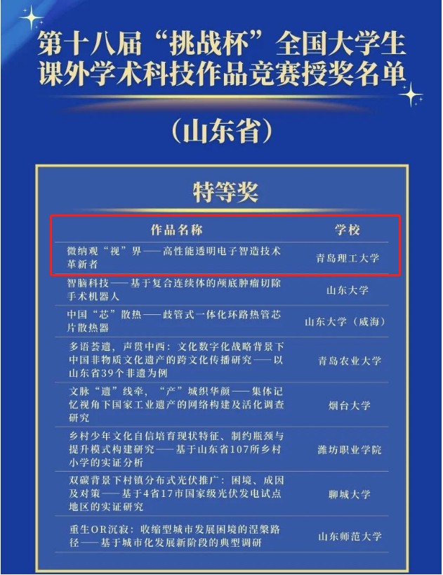 10月30日,第十八届“挑战杯”全国老员工课外学术科技作品竞赛在贵州大学落下帷幕,经过激烈角逐,betway西汉姆联平台参赛项目《微纳观“视”界——高性能透明电子智造技术革新者》(指导教师:朱晓阳、兰红波、杨建军;团队成员:王瑞、周君仪、段培开、张友超、商帅、台玉平、于志浩、张金宝)勇夺主体赛全国特等奖,创造了公司在此项竞赛中首次获特等奖记录。此项成绩也是betway西汉姆联平台在“挑战杯”系列竞赛中的最好成绩,实现了赛事重大突破。