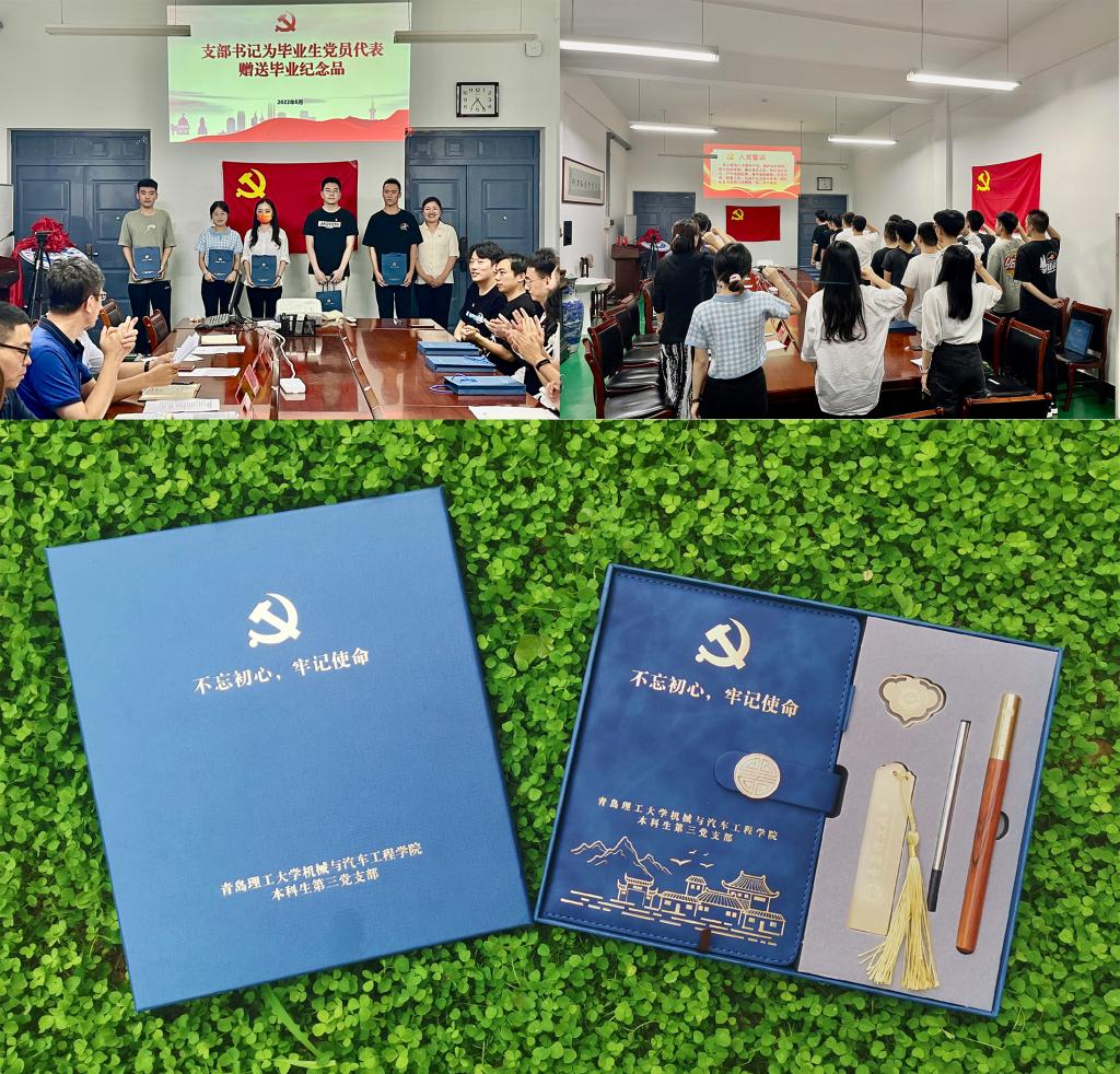 会上,各支部书记、毕业生辅导员为毕业生党员送上公司党委定制的毕业纪念品:一个党员学习记录本、一支笔、两枚印有校徽及院徽的书签,以激励各位毕业生党员坚持学习,牢记党的教诲,立志民族复兴,不负韶华、不负时代、不负人民。会上,全体党员重温入党誓词,进一步提醒党员要时刻保持光荣感、责任感和使命感,为党和国家的事业不懈奋斗。