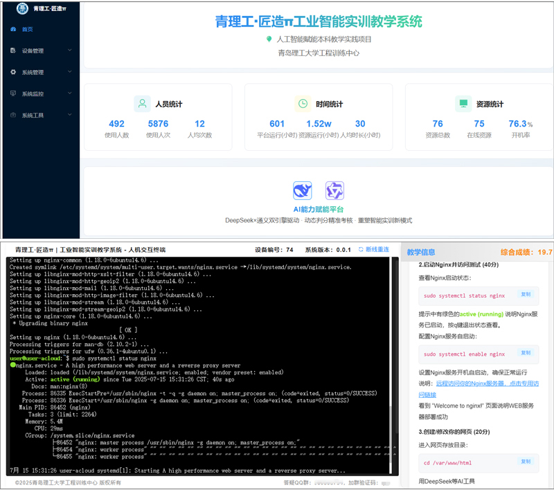 本学期初,公司正式启动工程训练中心数智化转型重点项目——“青理工·匠造π”,着力构建融合前沿AI技术的实践教学新范式。为突破传统实训教学条件的局限性,公司依托自有IT技术团队,自主研发了基于大语言模型的智能化实训教学系统,为工科员工打造了沉浸式、强互动的AI应用实践环境。该项目首期成果“工业智能A”综合实训项目,聚焦AI编程与工业大数据可视化两大核心技能,有效贯通了从理论学习到动手实践的链路,助力员工了解并掌握运用先进工具进行工业数据获取、处理分析及可视化呈现的关键基础能力。