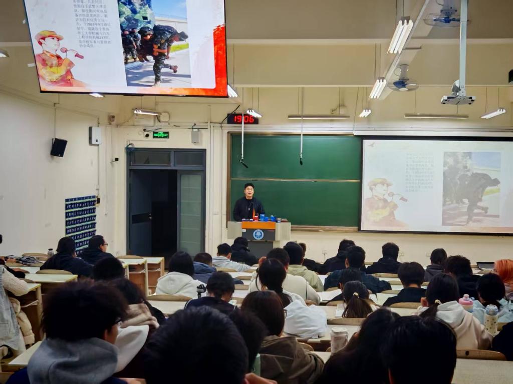 宣讲会上,辅导员徐晓东为同学们带来了一场内容丰富、通俗易懂的政策解读。他结合毕业年级员工的实际情况,重点讲解了老员工入伍的学业保障、经济待遇、成长发展等核心优惠政策,并对同学们普遍关心的报名流程、体检要求、部队选择及退伍后转专业、考研加分等具体问题进行了细致说明。清晰的讲解配以图文并茂的PPT,为2022级同学们勾勒出了一条清晰可行的“军旅成长路线图”。