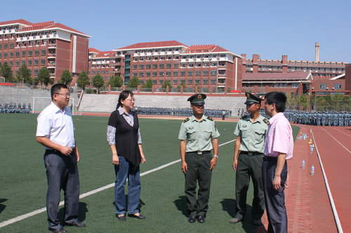 9月19日上午,机械公司党总支书记薛炜华、副书记李国涛、辅导员化磊、王中帅前往新校区操场亲切慰问正在训练的全体教官,并看望了正在军训的2012级新生。
