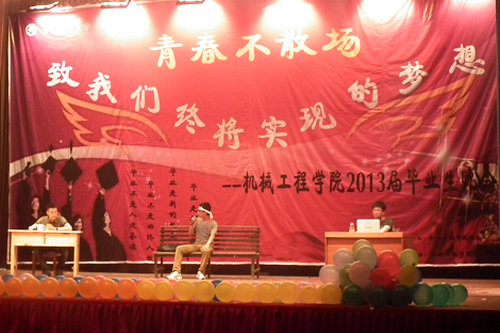 6月17日晚7点,机械公司“青春不散场,致我们终将实现的梦想”2013届毕业生晚会在北院礼堂举行。机械公司党政领导及相关部门科室负责人观看了晚会,与广大学子一同欢送2013届毕业生。 晚会在精彩绝伦的《舞狮表演》中拉开序幕,精湛的表演赢得了台下观众的阵阵掌声。浑厚有力、节拍强劲的鼓声,激动人心、动作灵活的狮舞,带着涌动的激情,霎时又豪情万丈。动感、激情、活力四射的《街舞表演》让现场为之沸腾;小品《那些年》及话剧《青春不毕业》精彩的演技、真情的告白,将晚会推上了高潮;歌曲《第一时间》《宽恕》《只对你有感觉》《那些年》再现了伴随同学们成长的一幕幕,带领大家重温经典,一同穿过时间的隧道,重温那些见证大家成长的歌声,也唱出了毕业生们的心声;山东快板表演艺术家、中国第一大掌门人李良老师、中国二级魔术师、青岛市魔术协会副主席史修章老师和青岛魔幻综合艺术团常务副团长谭荣东分别表演了《山东快板》、《魔术表演》和《川剧变脸》,将晚会推上一个新的高潮,魔幻的表演,诙谐的言语,紧凑的节拍,精彩的表演赢得了观众阵阵热烈的掌声。 晚会歌舞交融,形式多样,内涵丰富,给毕业生们留下了一个难忘的夜晚。说不尽的离别情,道不完的留恋意。这是一个难忘的夜晚,今夜的机械公司充满着欢笑、泪水、感动与不舍,但更多的是对未来的美好希冀,衷心的祝愿2013届毕业生在将来的工作中一帆风顺,心想事成,为人生添彩、为母校争光!(机械公司 贺原野)