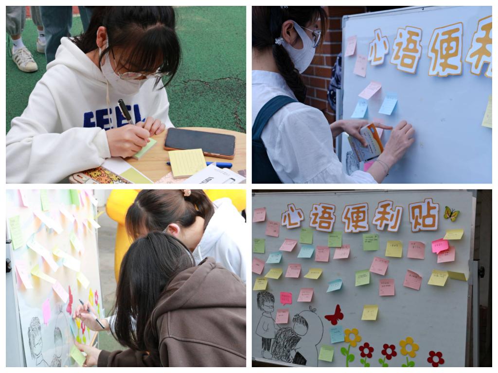 活动场地还摆放了“释放压力”心情展板,“分享组”志愿者为同学们提供便利贴,让他们在展板上“诉说”生活学习中的压力和对未来的美好期许,可以是文字,也可以是简笔画,纾解心情,减压前行。活动最后,与会老师与员工共同参加了“‘雨露’润泽心灵,‘疫’路相伴成长”主题条幅签名,为心赋能,共迎未来。