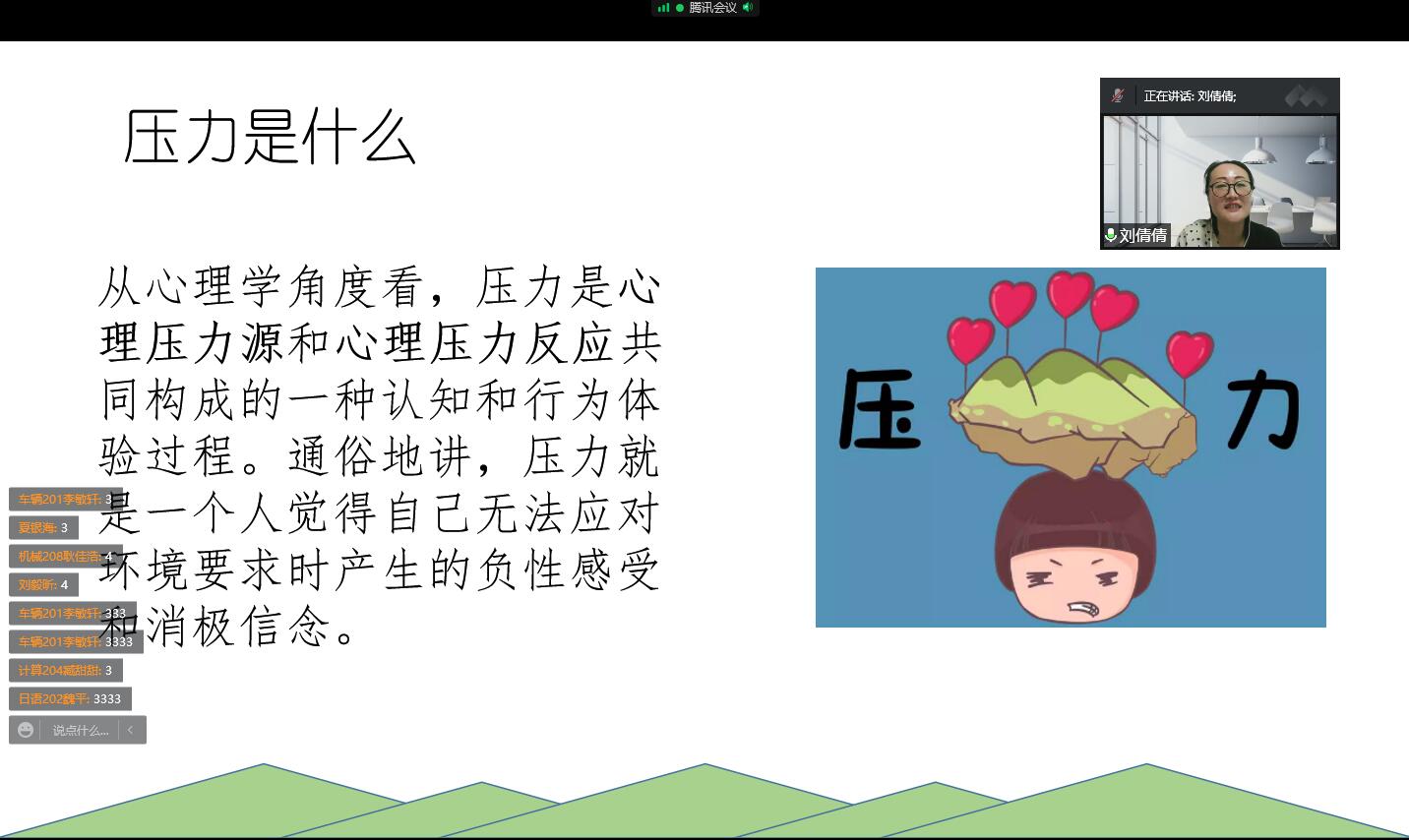 缓解心理压力,增进心理健康。“刘老师的报告既有理论高度,也有很强的实践操作性,员工心理健康成长与教育者积极引导息息相关,不同年级的员工面临的压力不一样,我们要掌握心理健康知识,帮助员工及时感知压力、化解压力,为员工解疑答惑。”人文与外国语公司心理联络员辛雪梅这样说。机械204班王政说:“刘老师的讲课让我学到很多,接下来我要正确看待学习压力,变压力为动力,在压力中成长为更好的自己。”