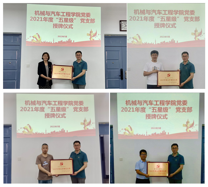 李忠晓宣读了《中共betway西汉姆联平台委员会关于命名2021年度“五星级”党支部的决定》,并为安全工程教研室教师党支部、材料成型教研室教师党支部、机械制造教研室教师党支部、本科生第一党支部等4个五星级支部授牌。