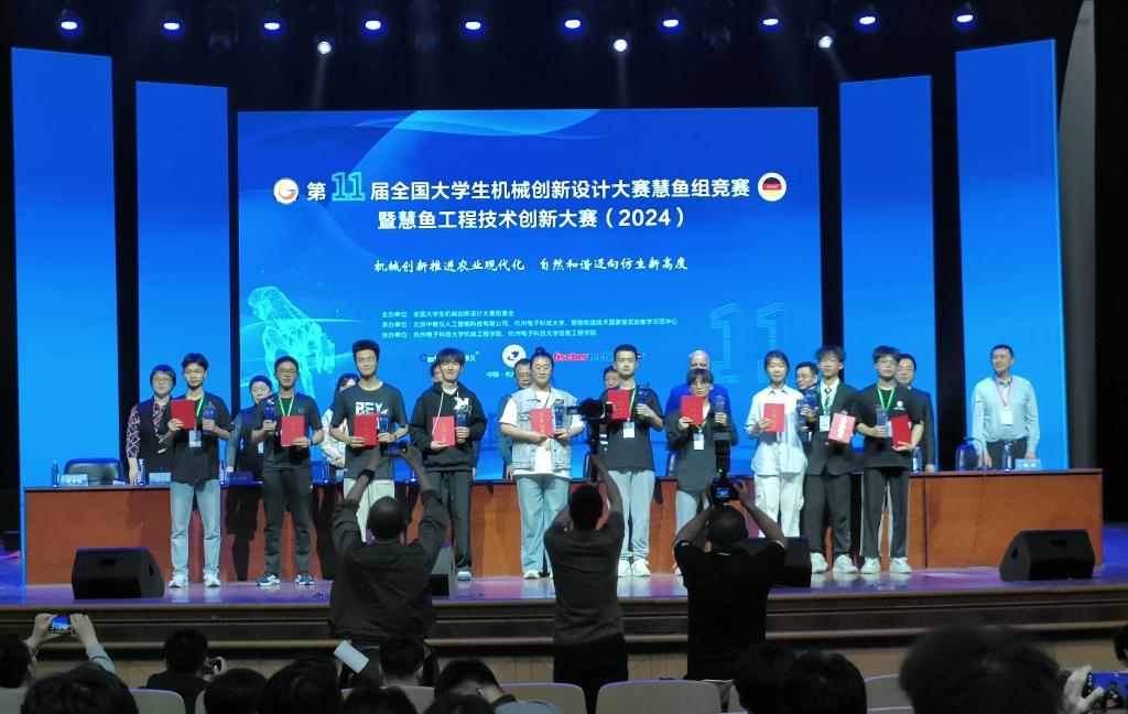 经过现场路演和专业评审,参赛作品《自走式小型智能高效播种机》《“藕见倾心”——自动化莲藕采摘及处理一体机》《“萝动先锋”萝卜收割机》《全自动韭菜收割称重打捆一体机》《佳藕妙采——自适应高效智能莲藕收获分选一体机》获得一等奖;参赛作品《基于慧鱼模块的智能化摘茄机》《芋头自动播种机》《争奇“豆”艳——一种自走式智能双行黑豆播种机》获得二等奖;参赛作品《自走式轻量化结球白菜全自动收获机》《自动菠菜收获打包机》获得三等奖。