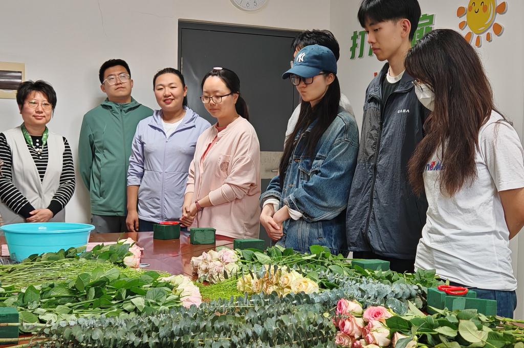 同学们在老师的指导下,纷纷拿起剪刀,根据不同的花材进行整理、修剪,彼此分享交流,将自己的细腻感受和浪漫诗意寓情于花、借花寓意,在一修一剪间,感受自由创造的乐趣和自然平衡之美。“这次活动不仅仅是一场体验,更是一场找回心灵平衡的旅程,选花、剪枝、摘叶的过程很治愈,让我从紧张的毕业设计中放松下来,舒缓身心。”2024届毕业生王坤同学分享道。