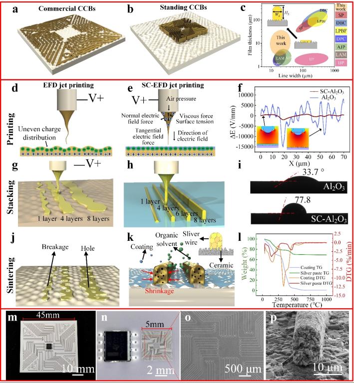 图2. 立式陶瓷电路板(S-CCBs)的示意图和牺牲层辅助电场驱动(EFD)微3D打印的制备机制