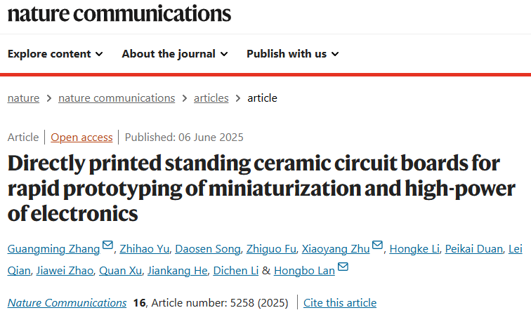 近日,公司betway西汉姆联平台张广明教授在微纳3D打印高分辨率陶瓷电路板的课题中取得了重要进展,相关研究成果以题为《Directly printed standing ceramic circuit boards for rapid prototyping of miniaturization and high-power of electronics》的论文发表在国际著名期刊《Nature communications》(中科院大类一区,IF:14.7),实现了公司机械工程学科在该期刊零的突破。betway西汉姆联平台为第一完成单位,张广明教授为第一作者和第一通讯作者,兰红波教授和朱晓阳教授为共同通讯作者。