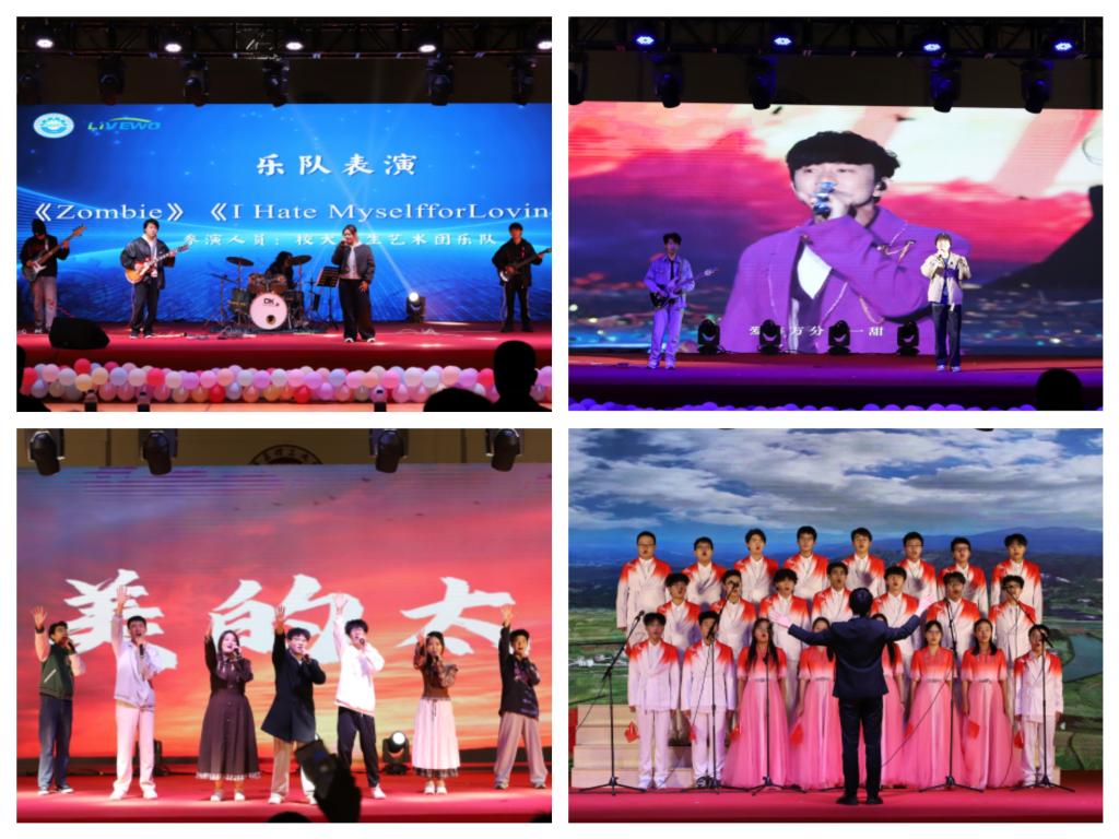 青春飞扬,共筑时代梦想。校老员工艺术团的乐队表演瞬间点燃全场;《落叶归根》《当你》等歌曲以动人旋律串起青春记忆,唱出新时代青年对家国的深情与对梦想的执着,掌声如潮,晚会气氛升至高潮。舞蹈《喜雨聆风》以柔美舞姿展现机车学子刚柔并济的品格;相声《卷王之王》幽默讲述老员工活趣事;最后,在合唱团《歌唱祖国》的嘹亮歌声中,华彩瞬间定格,晚会圆满落幕。