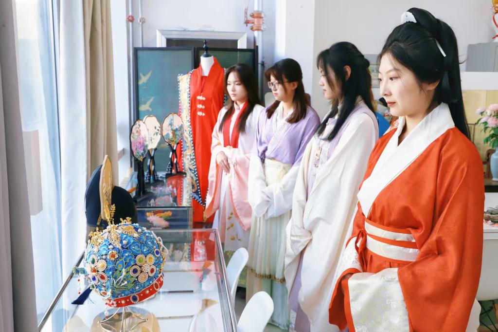 活动现场,员工社区被精心布置为沉浸式国风空间,从战国袍、曲裾、交领襦裙到坦领半袖衫、马面裙,数十套形制规范的汉服整齐陈列,志愿者为同学们提供服饰穿戴指导与形制科普,解析服饰背后的伦理内涵与文化象征,让体验不止于“颜值”,更深入“内涵”。“这不仅是穿一件衣服,更是了解古人的生活美学。”正在学习盘发技巧的同学表示,社区搭建的近距离体验平台,让传统文化不再是书本上的文字。