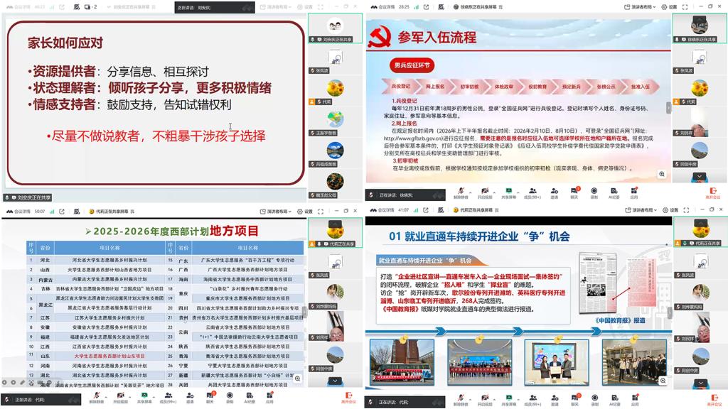 会议伊始,代莉介绍了本次家长课堂的召开目的和意义。在心理调适指导环节,刘安庆围绕考研后毕业生常见的焦虑、迷茫等情绪状态,进行了专业且通俗的解读。他结合典型案例,系统分享了科学有效的情绪疏导方法与亲子沟通技巧,引导家长做好孩子的“心理后盾”,以理解、包容与鼓励帮助孩子平稳度过考后缓冲期,为现场家长送上了一份实用的“心理指南”。征兵政策宣讲环节,徐晓东老师详细解读了2026年最新征兵条件、入伍优待政策、发展前景等家长关切的内容,从职业发展、政策扶持等多个维度,为有入伍意向的员工家长提供了指引,拓宽了毕业生家长的就业视野。就业形势解析与西部计划介绍环节,毕业生辅导员代莉依托国家权威数据与行业动态报告,客观分析了2026 届高校毕业生就业整体态势、行业需求分化特点,以及求职及多元就业赛道的机遇与挑战,引导家长理性看待就业市场,科学规划职业发展路径,详细介绍了西部计划的价值与意义,鼓励毕业生将个人理想融入国家发展,到基层去、到祖国最需要的地方去实现青春价值,为学子们提供了兼具担当与成长的多元选择。互动答疑环节,家长们踊跃提问,围绕孩子心理疏导、征兵政策细节、西部计划申报、就业规划等问题与现场嘉宾深入交流。嘉宾们耐心细致地逐一解答,现场氛围热烈而融洽,有效破解了家长们的困惑与担忧。