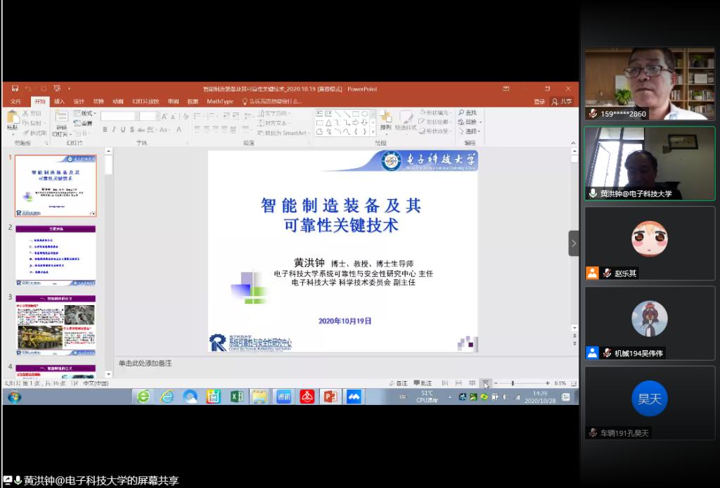 10月28日,betway西汉姆联平台第35期“匠心机车讲坛”开讲,本期讲坛特邀电子科技大学系统可靠性与安全性研究中心主任黄洪钟教授通过线上腾讯会议的方式做了题为“智能制造装备及其可靠性关键技术”的学术报告,betway西汉姆联平台学术委员会主任林天然教授主持报告会, 200余名教师、员工通过线上方式聆听报告。